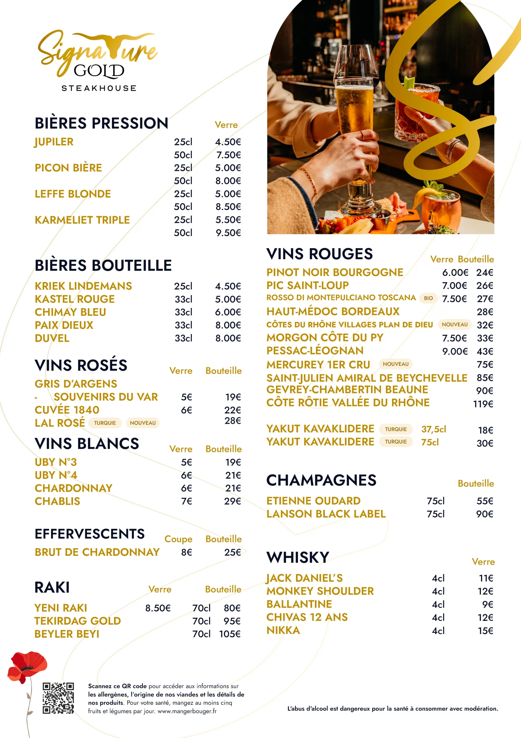 Signature Gold vous accueille du mardi au dimanche pour savourer des viandes d’exception et des grillades au feu de braise.