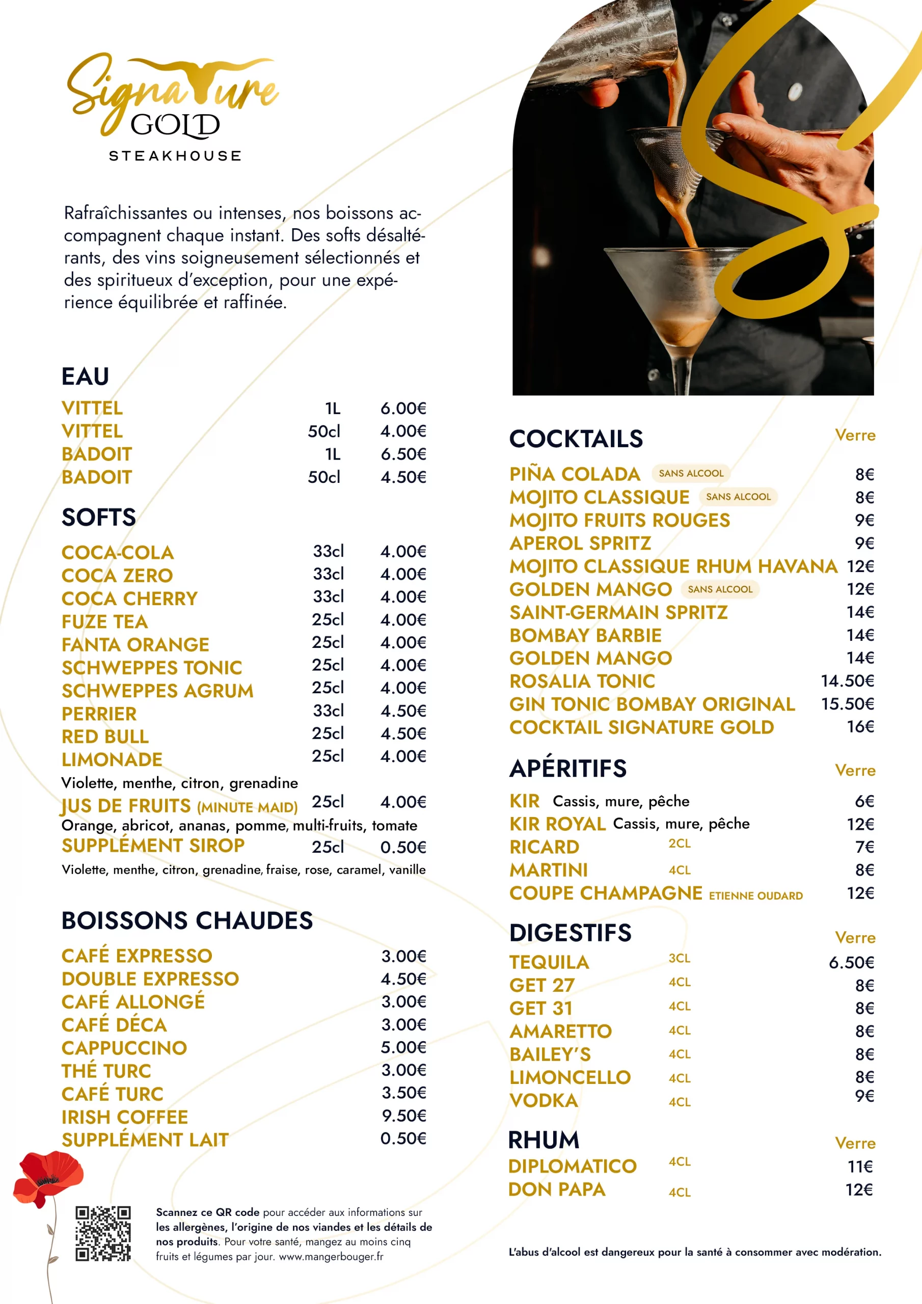 Rafraîchissantes ou intenses, nos boissons accompagnent chaque instant. Des softs désaltérants, des vins soigneusement sélectionnés et des spiritueux d’exception, pour une expérience équilibrée et raffinée.