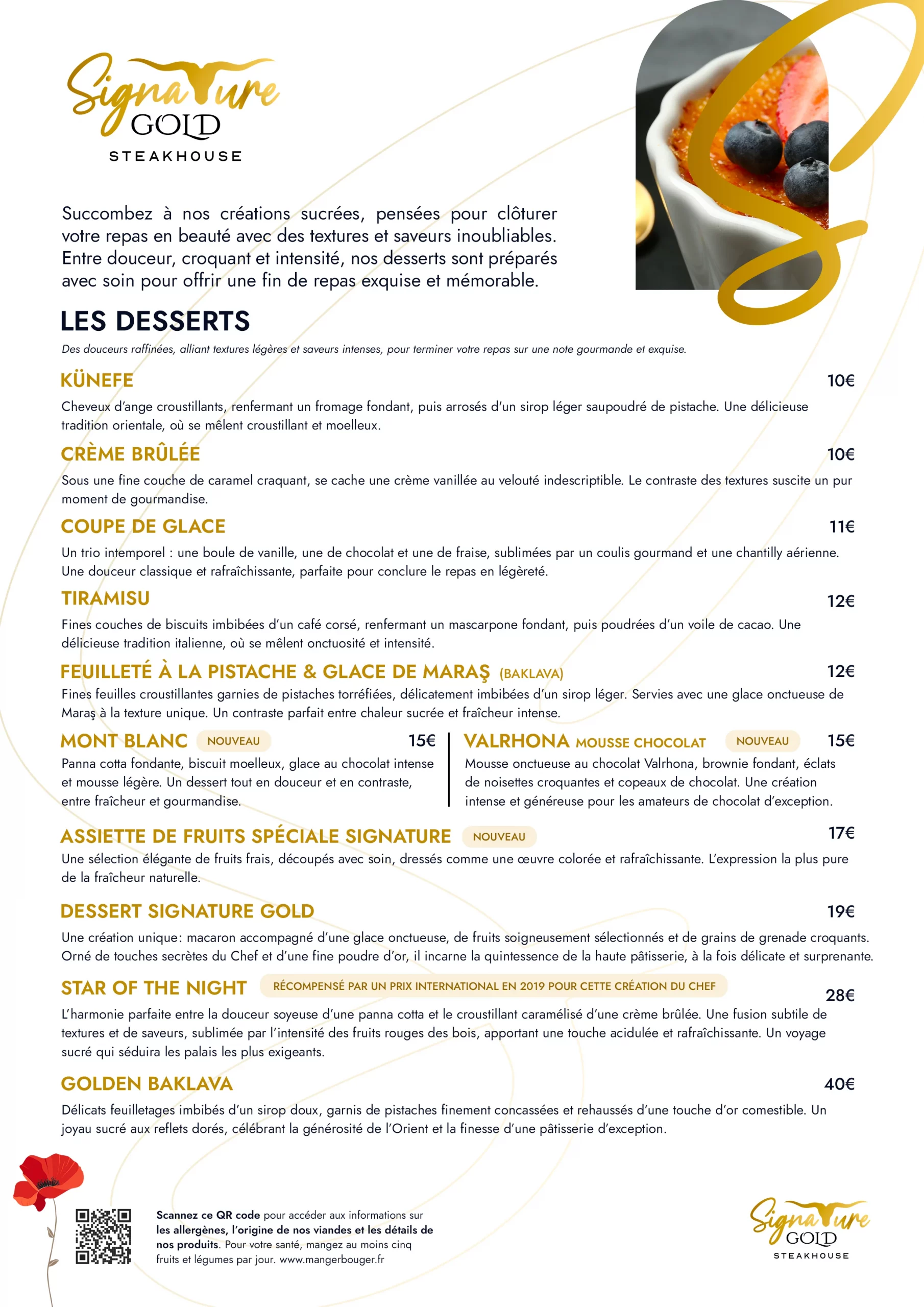 Signature Gold vous accueille du mardi au dimanche pour savourer des viandes d’exception et des grillades au feu de braise.