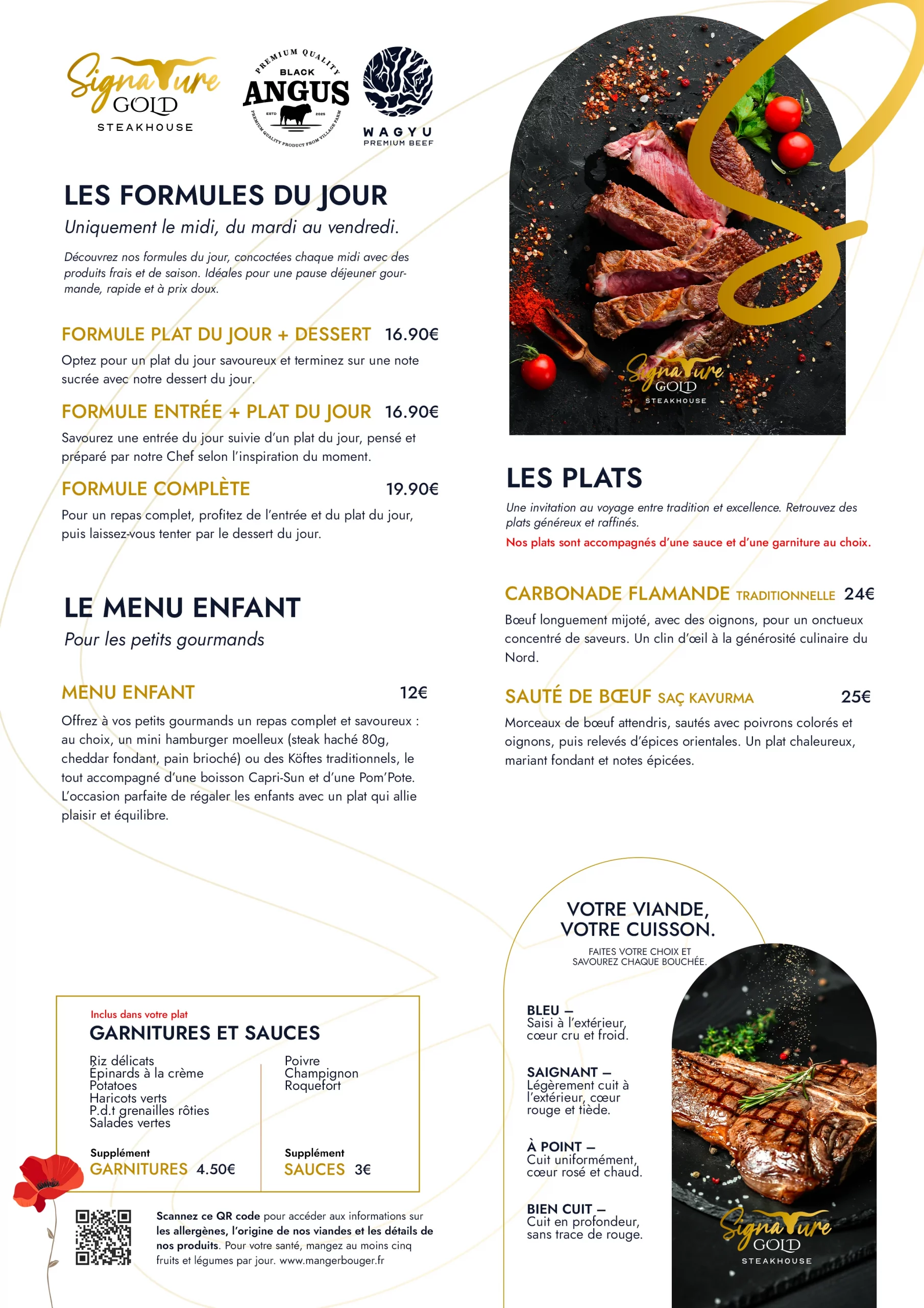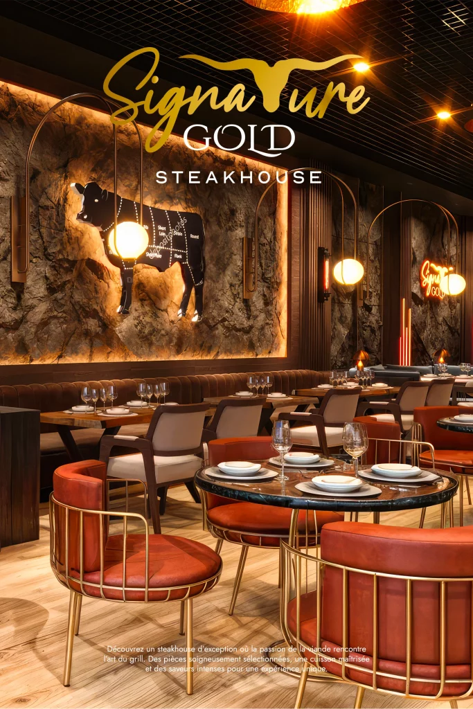 Signature Gold vous accueille du mardi au dimanche pour savourer des viandes d’exception et des grillades au feu de braise.
